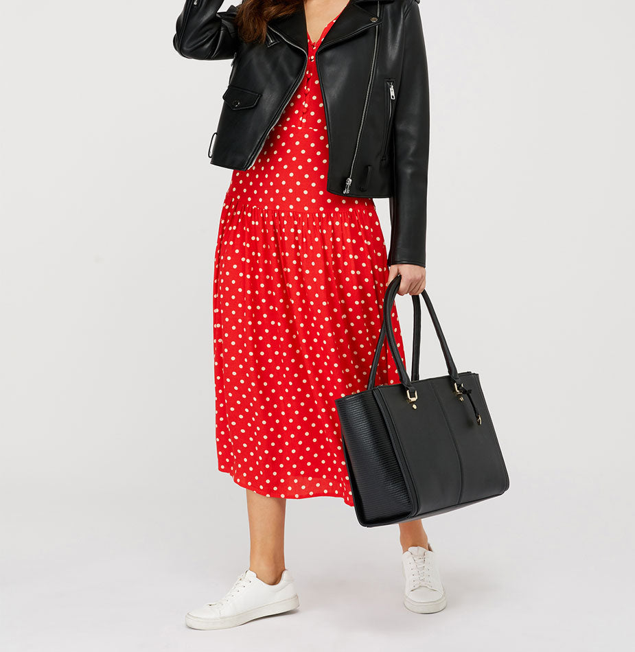 This product is registered with The Vegan Society and is free from animal products.This classic tote makes the perfect everyday bag. It’s designed in durable faux leather and features textured sides, three zipped compartments and a magnetic press stud fastening. To carry, there’re two shoulder straps or an optional, adjustable cross-body strap.